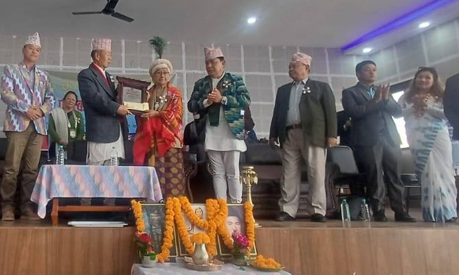 दोस्रो फाल्गुनन्द साहित्य महोत्सवमा वीर नेम्बाङ र उपेन्द्र सुब्बा पुरस्कृत हुँदै
